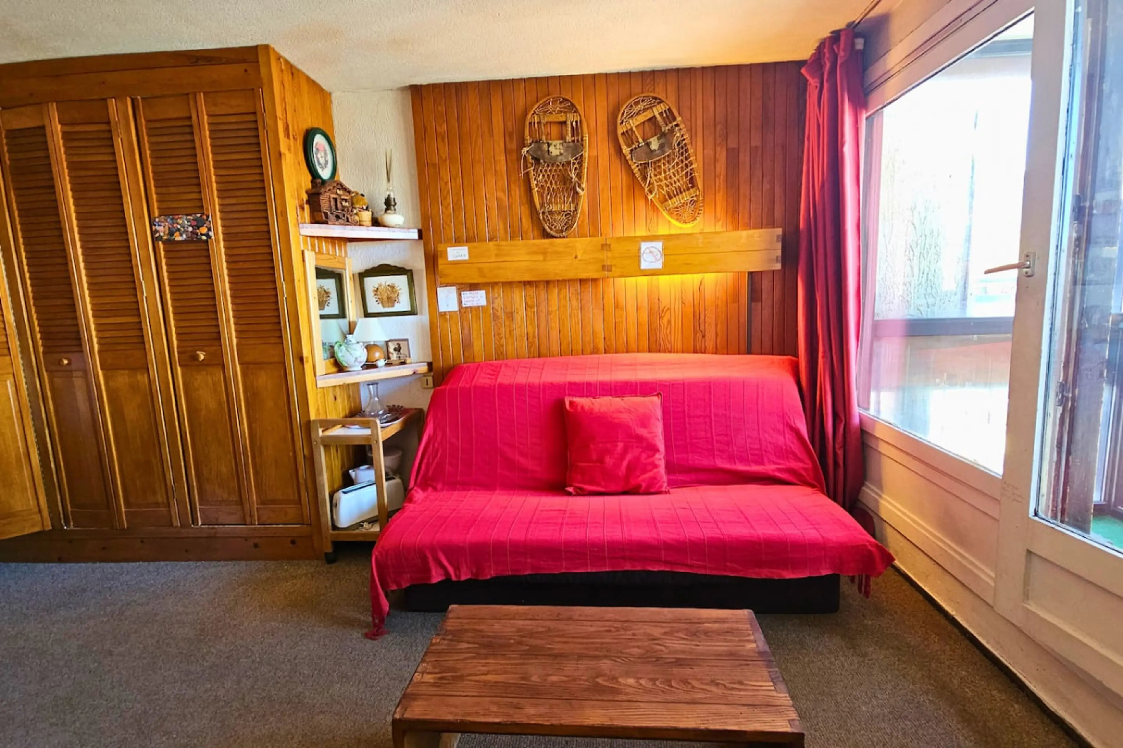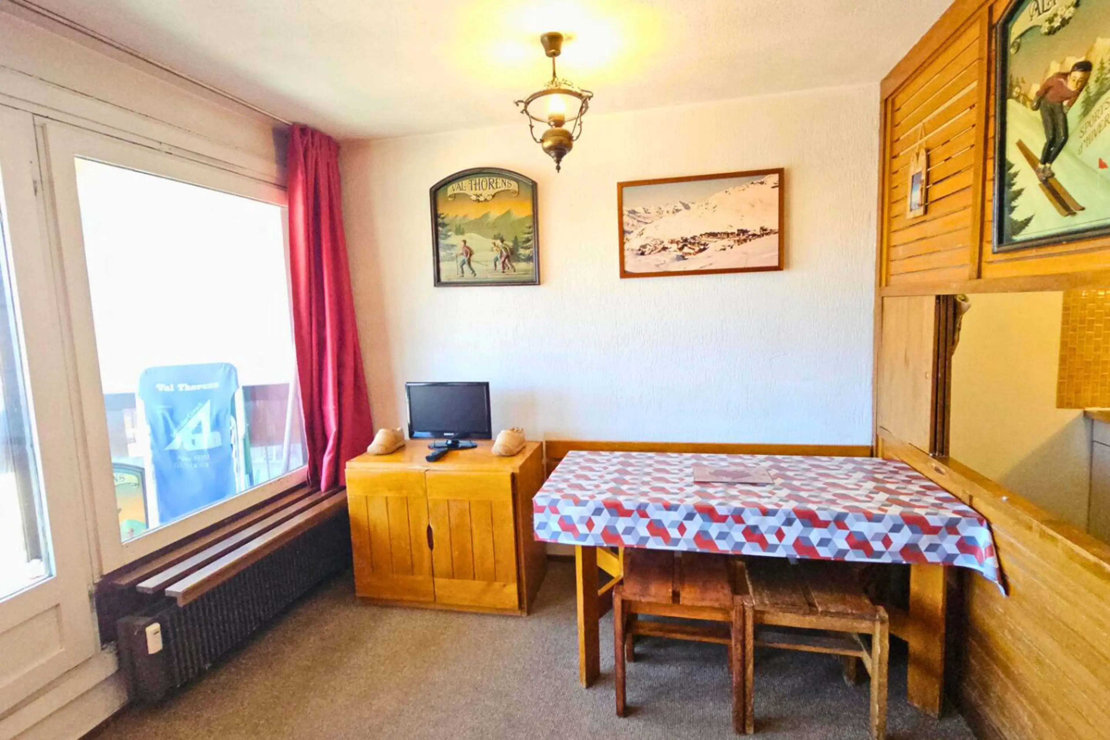 Cozy studio in Les Neves Residence, Val Thorens. Central location near slopes, shops, and restaurants. Sleeps up to four with a bunk bed and sofa bed. Includes kitchenette and ski storage. Linens and towels available for 30 € per set. Perfect base for skiing or relaxing in the heart of the resort.