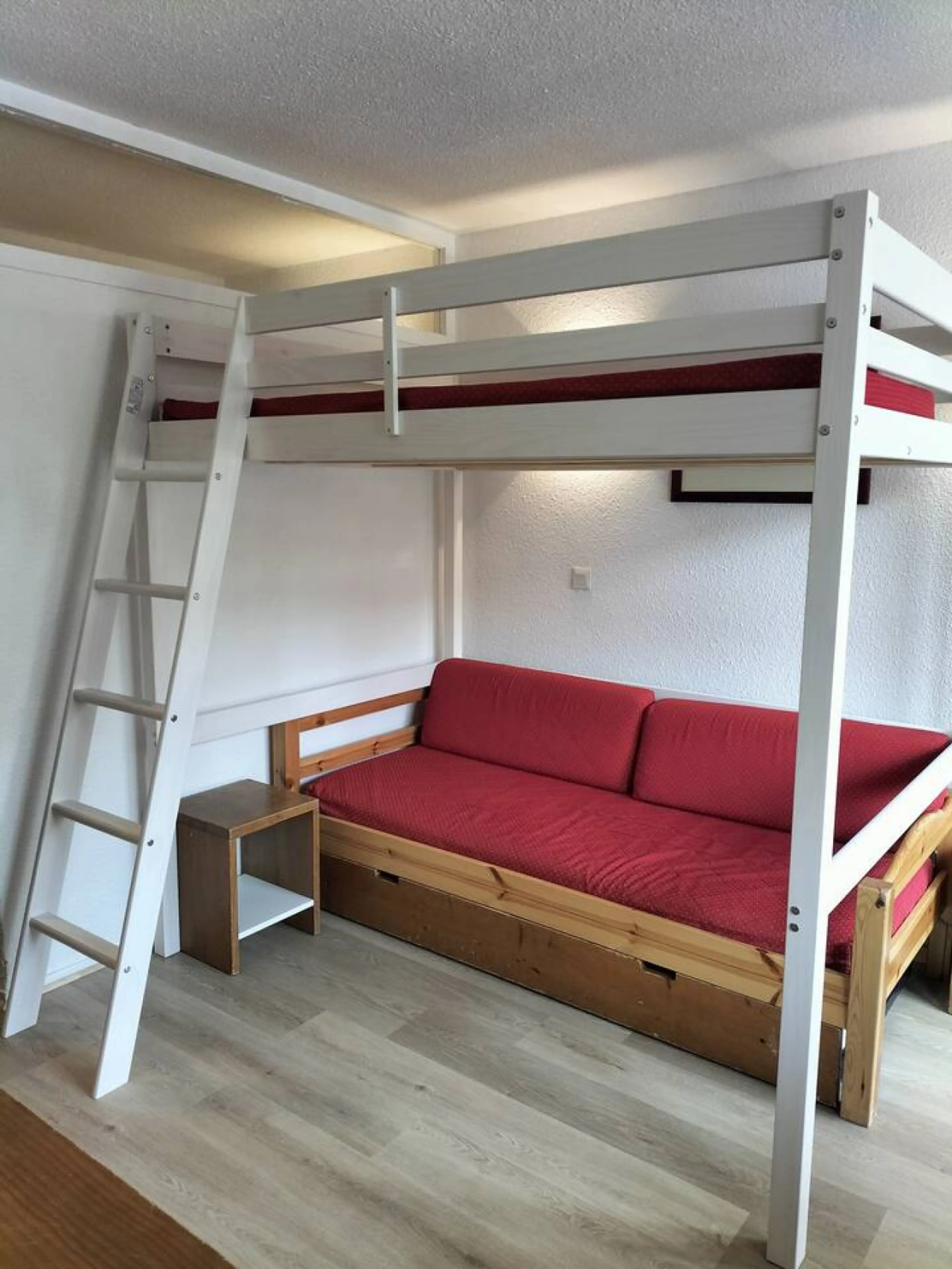 30 m² apartment in Olympiades Residence, Val Thorens. Half-renovated with new paint and parquet. Small cabin with bunk beds, living room with sofa bed and mezzanine with double bed. Fully equipped kitchen. Comfortable and bright, ideal for 4 people (max 5). Ski-in/ski-out location, close to lifts an...