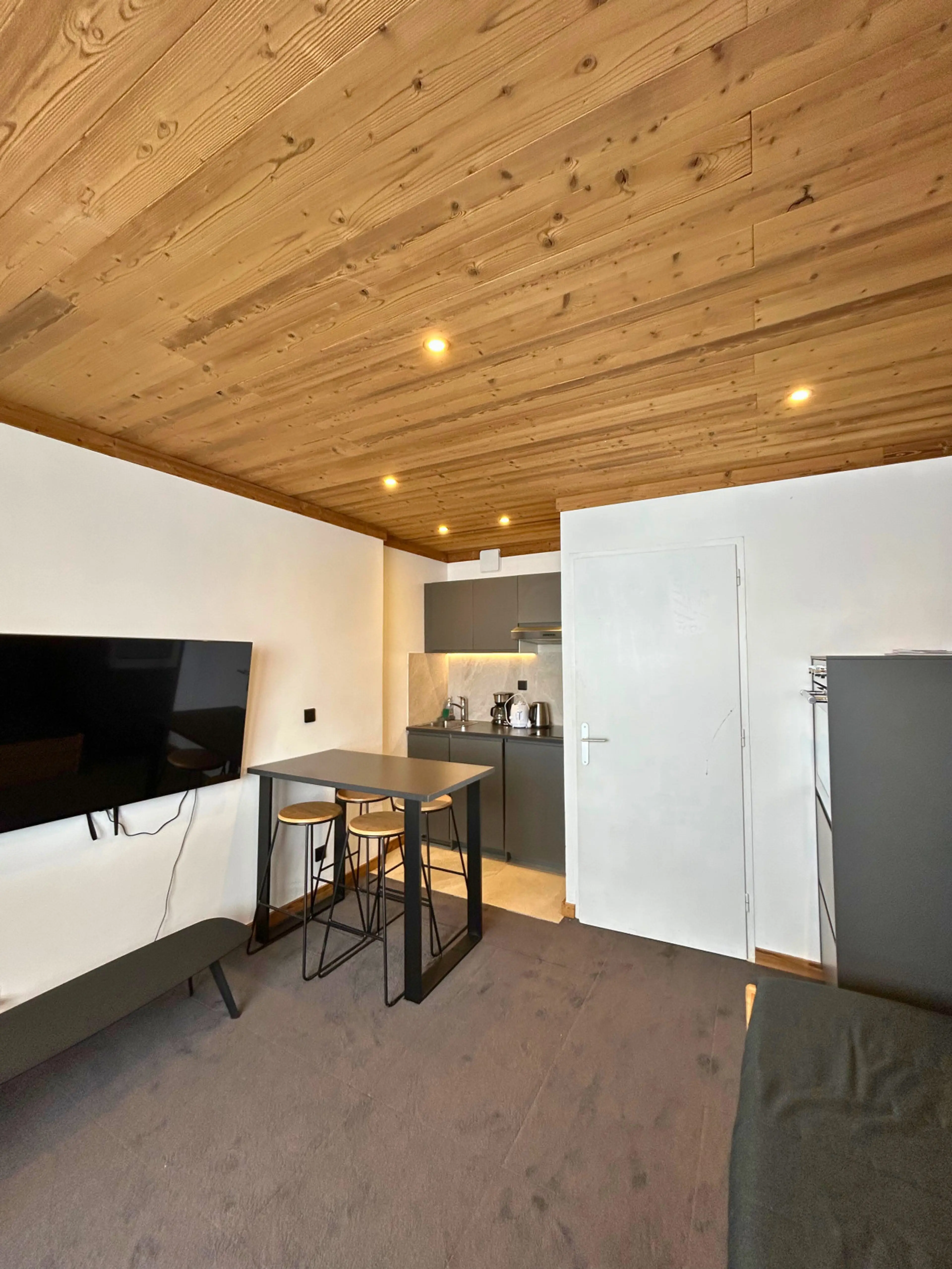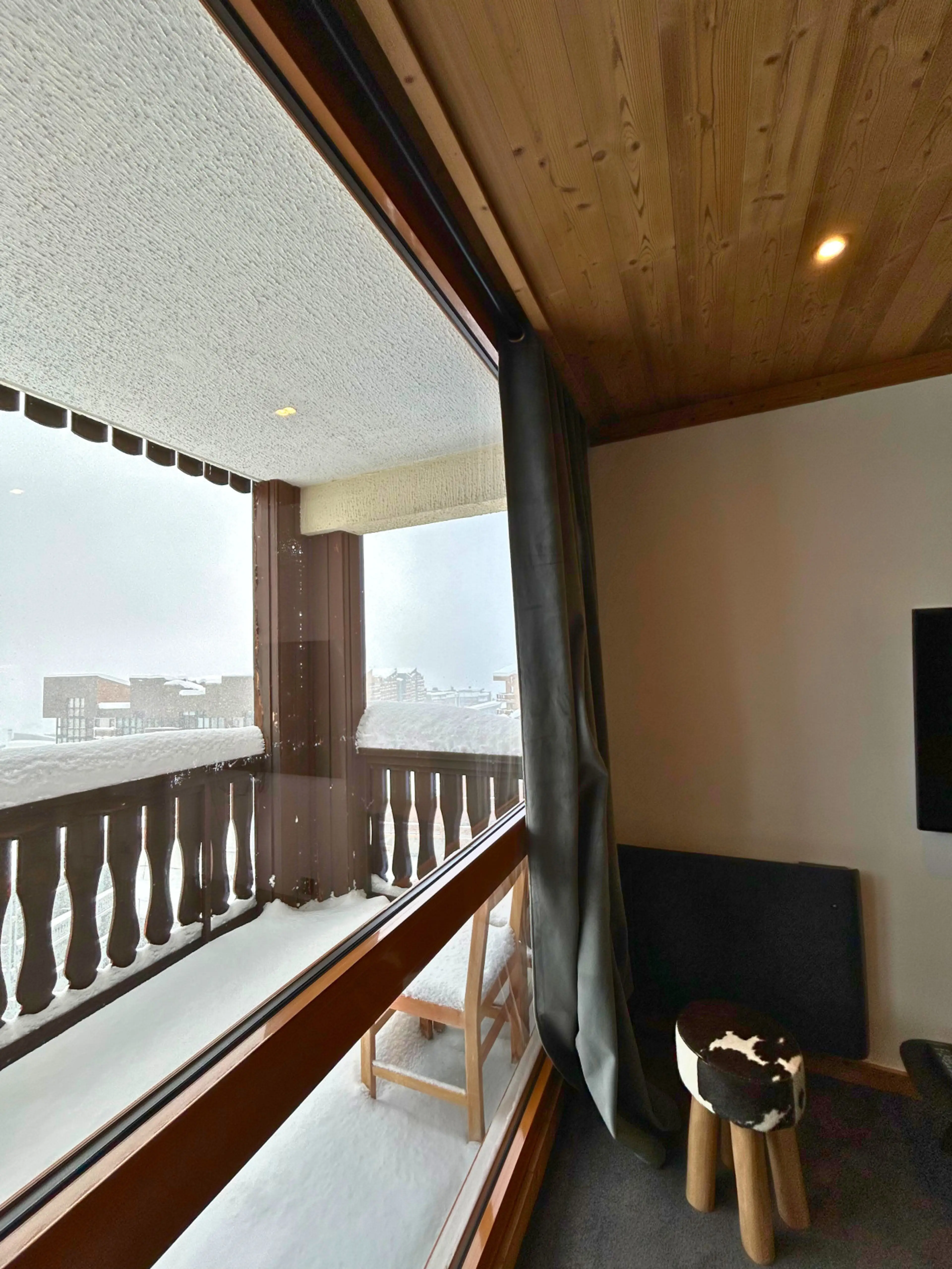 Renovated 28 m² studio in the center of Val Thorens, in Résidence Lac du Lou. Sleeps 4 with a bunk bed at the entrance and another bunk bed in the living area. Bright living room with a fully equipped modern kitchen. Unbeatable central location—steps from lifts, shops, and restaurants. Linens/towel...